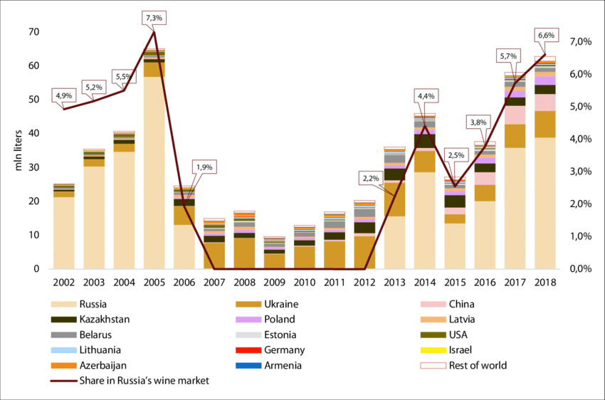 In 2023, Georgia exported $262M of Wine, making it the 14th largest exporter of Wine (out of 188) in the world. During the same year, Wine were the 4th most exported product (out of 991) in Georgia. In 2023, the main destinations of Georgia's Wine exports were: Russia ($168M), Poland ($15.5M), Ukraine ($15.2M), China ($11.7M), and Kazakhstan ($9.41M).